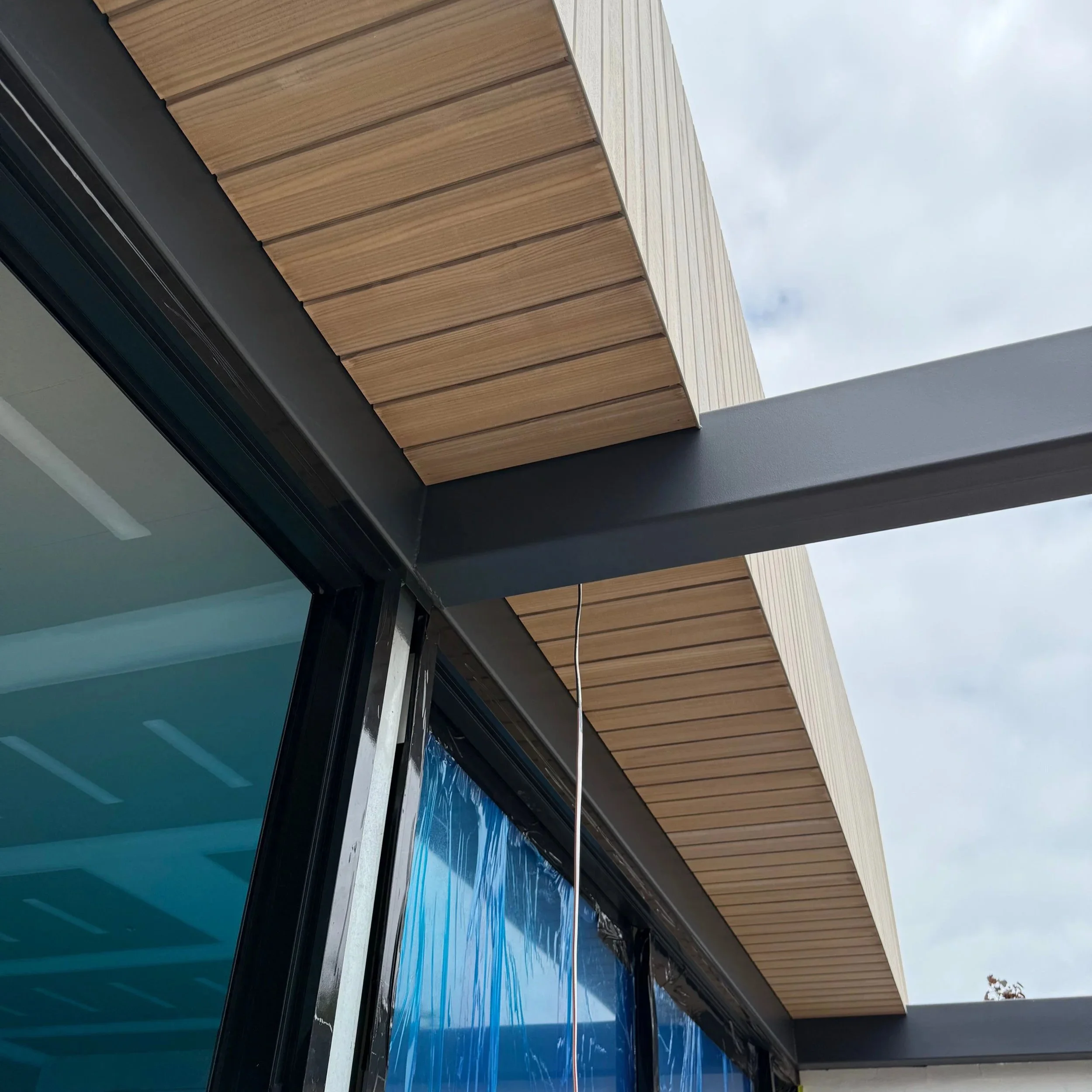 The Vulcan timber up close, cutting in with the exposed beams of the pergola.