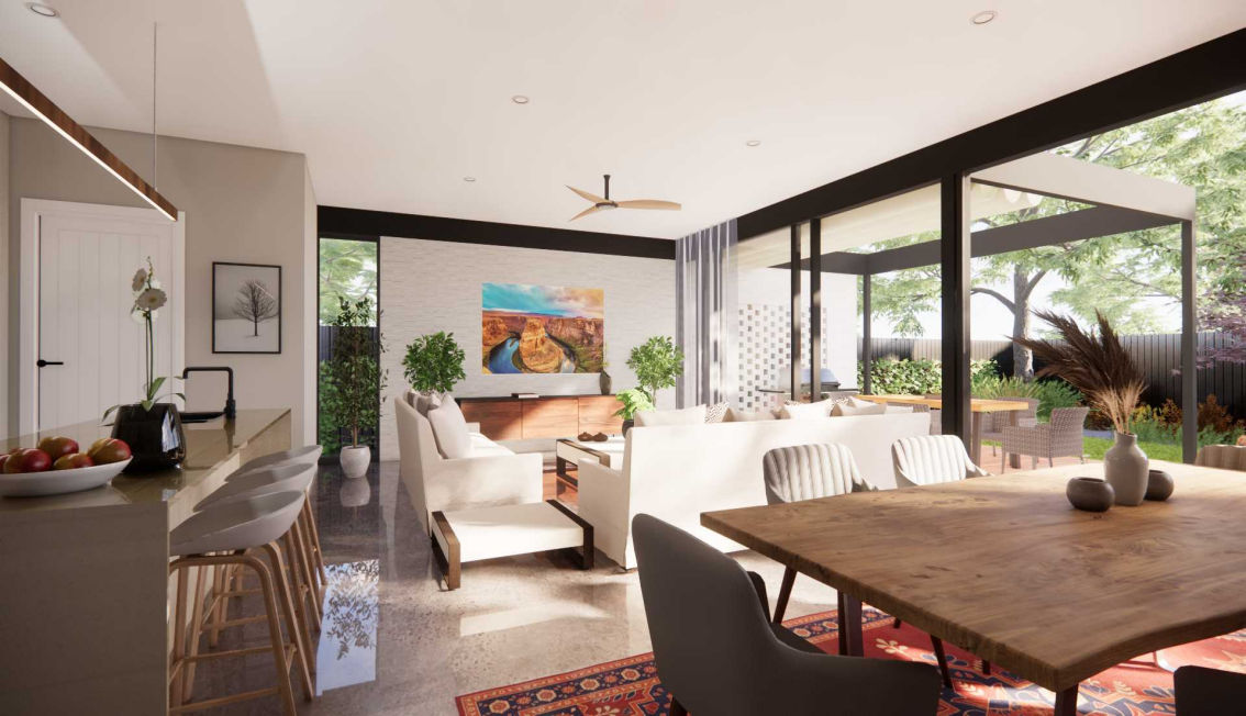 The goal for this design is to create two like-for-like replacements of the original duplex. The two homes, split by a common wall running from front to back, will mirror each other almost identically. Both with two bedrooms, two bathrooms, a study nook, and an open-plan kitchen, living and dining that connects seamlessly with a north-facing alfresco.