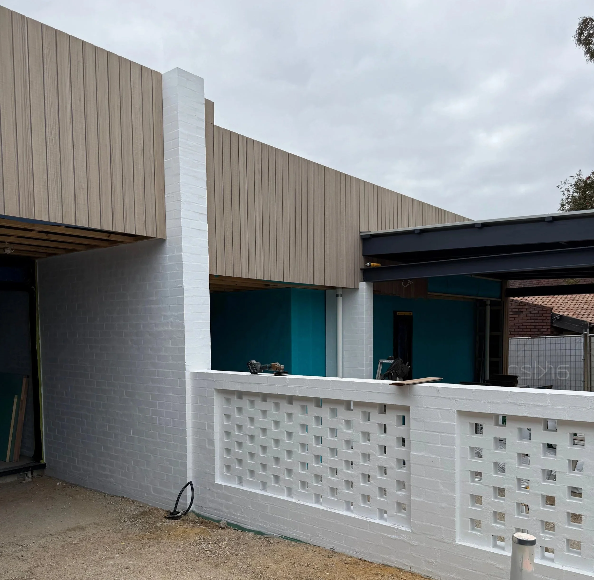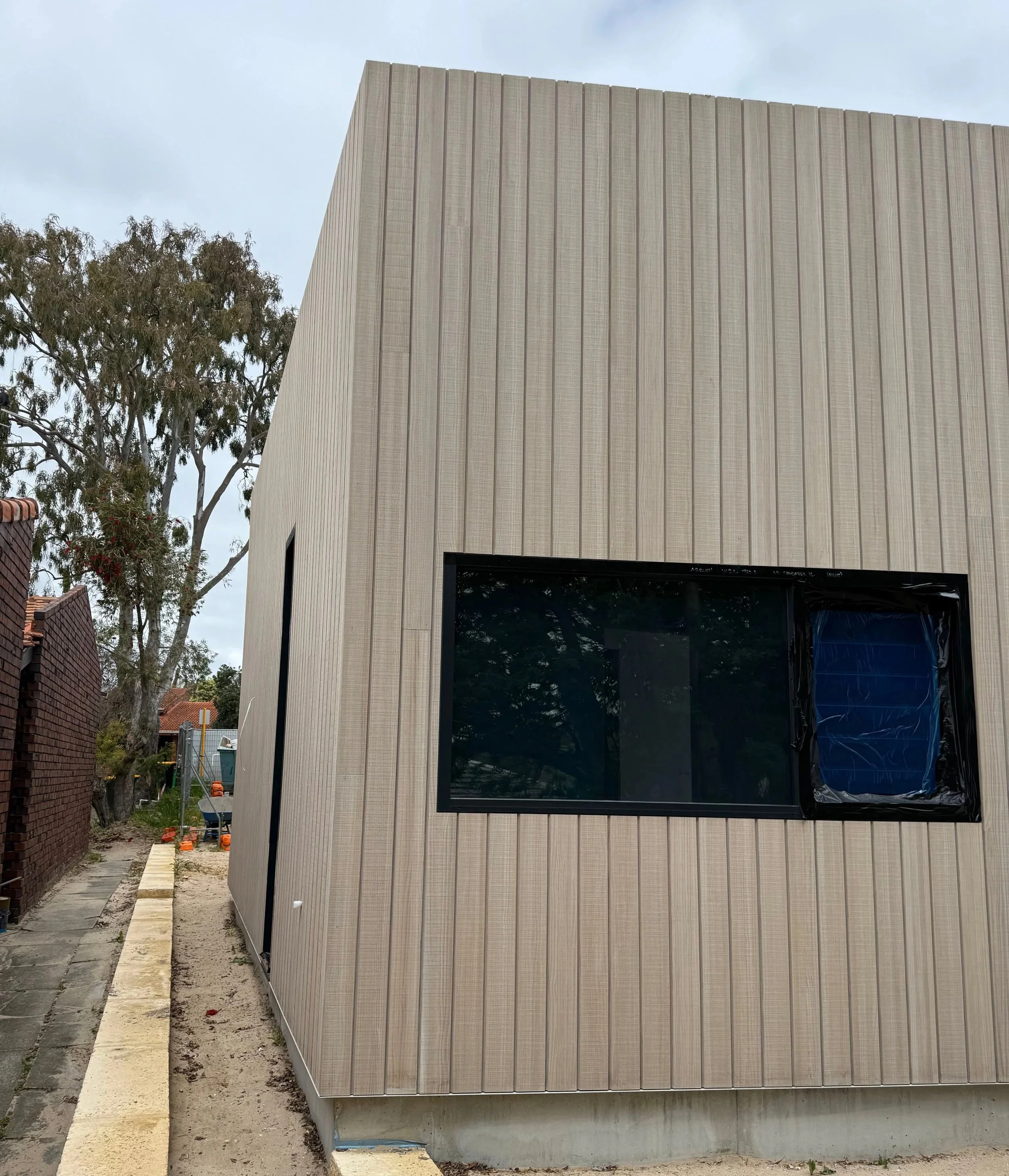 On a quiet street in the hilly suburb of Wembley Downs, a pair of nearly identical new builds are well underway. Here, an old duplex is being replaced with two energy-efficient, mid-century modern homes.. About halfway through the build, we’re now at a stage when things are really starting to take shape and it’s the perfect time to drop in and see how it’s all coming along.