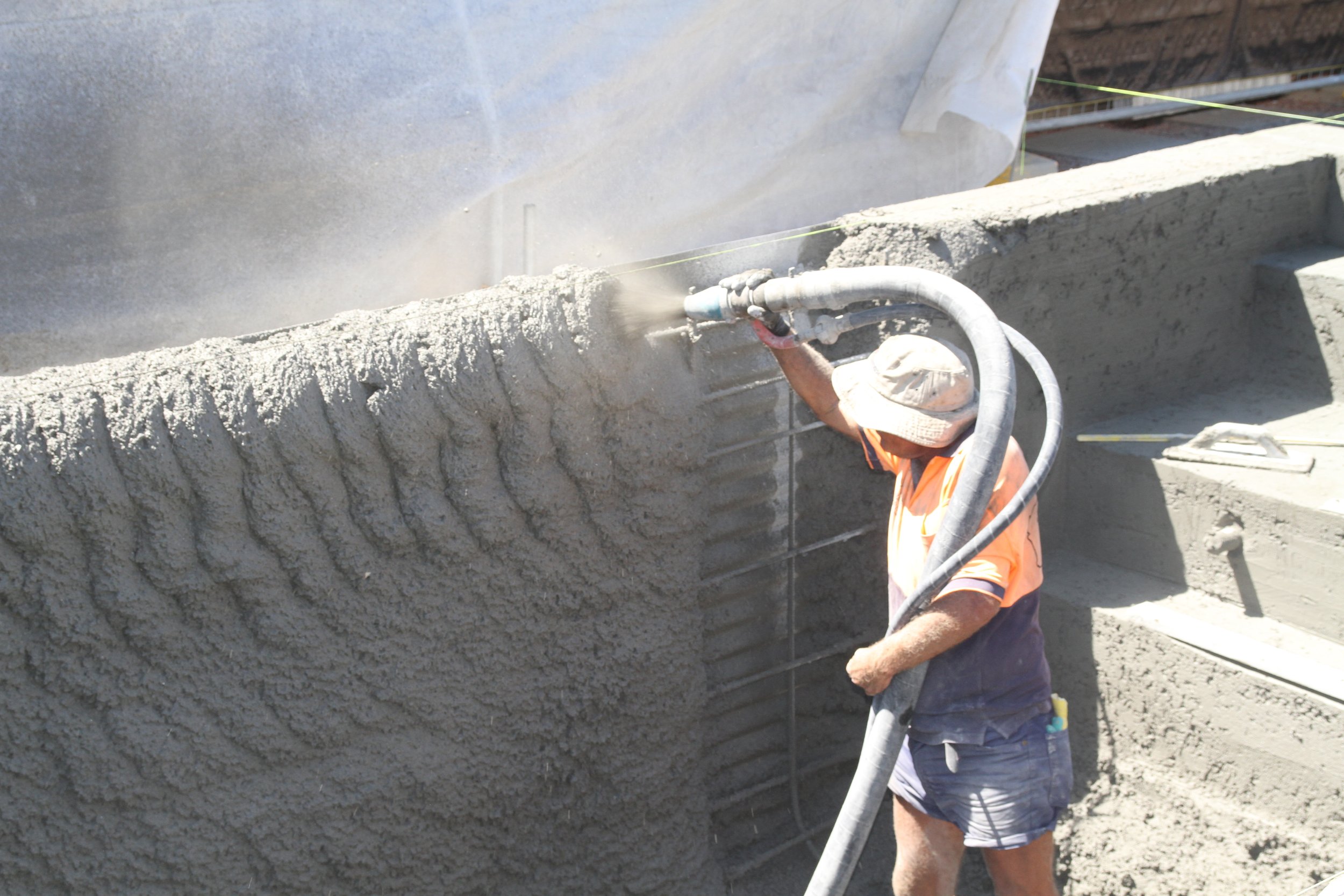 Concrete being sprayed over the formwork.