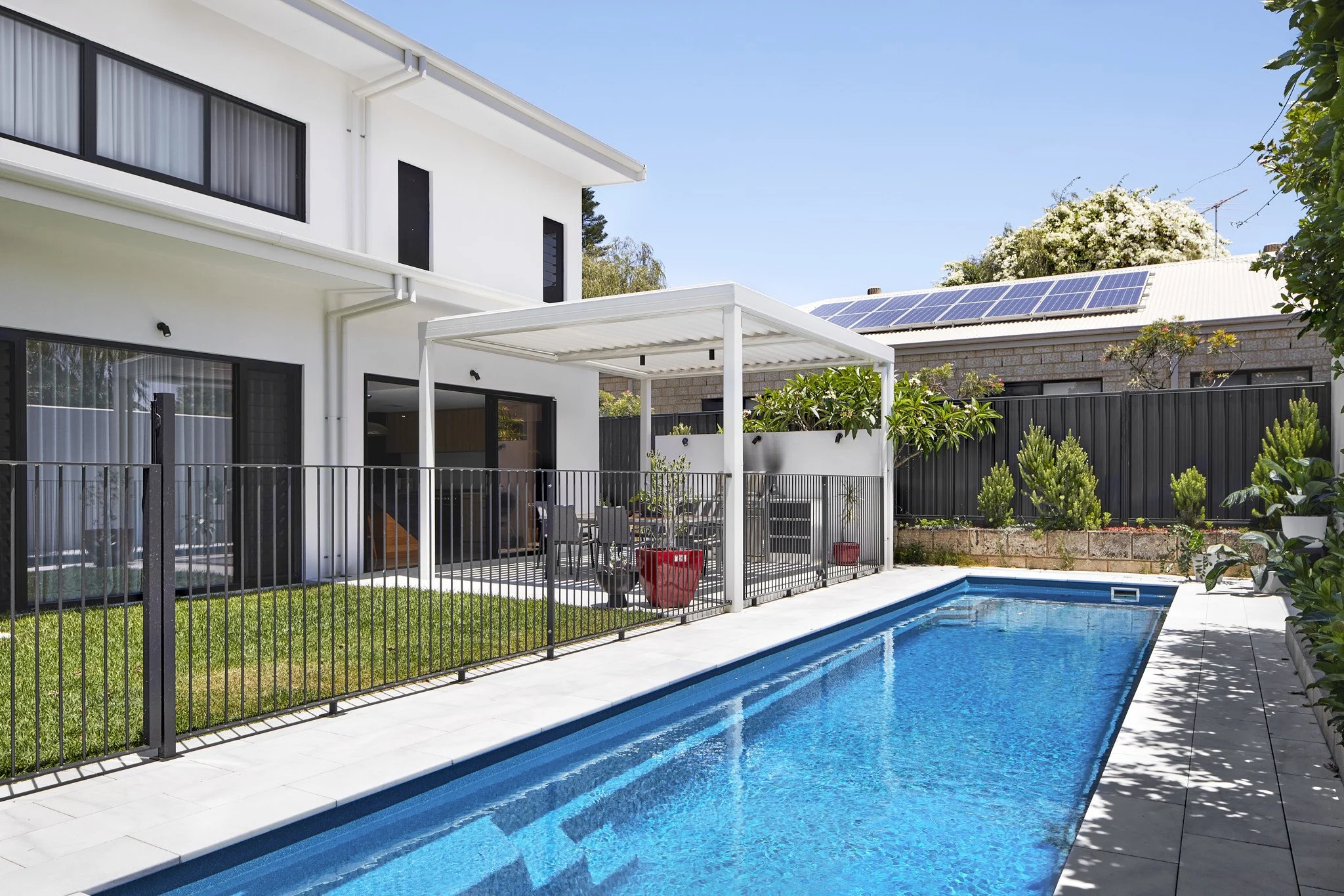 Climbing: A non-climbable zone of 900mm is also required around pool safety barriers. This means that no climbable objects, such as furniture and plants, are allowed near the fence. If your pool is near a boundary fence, this also includes anything on your neighbour’s property—in which case you’ll need to build something that blocks access from the neighbour’s side.